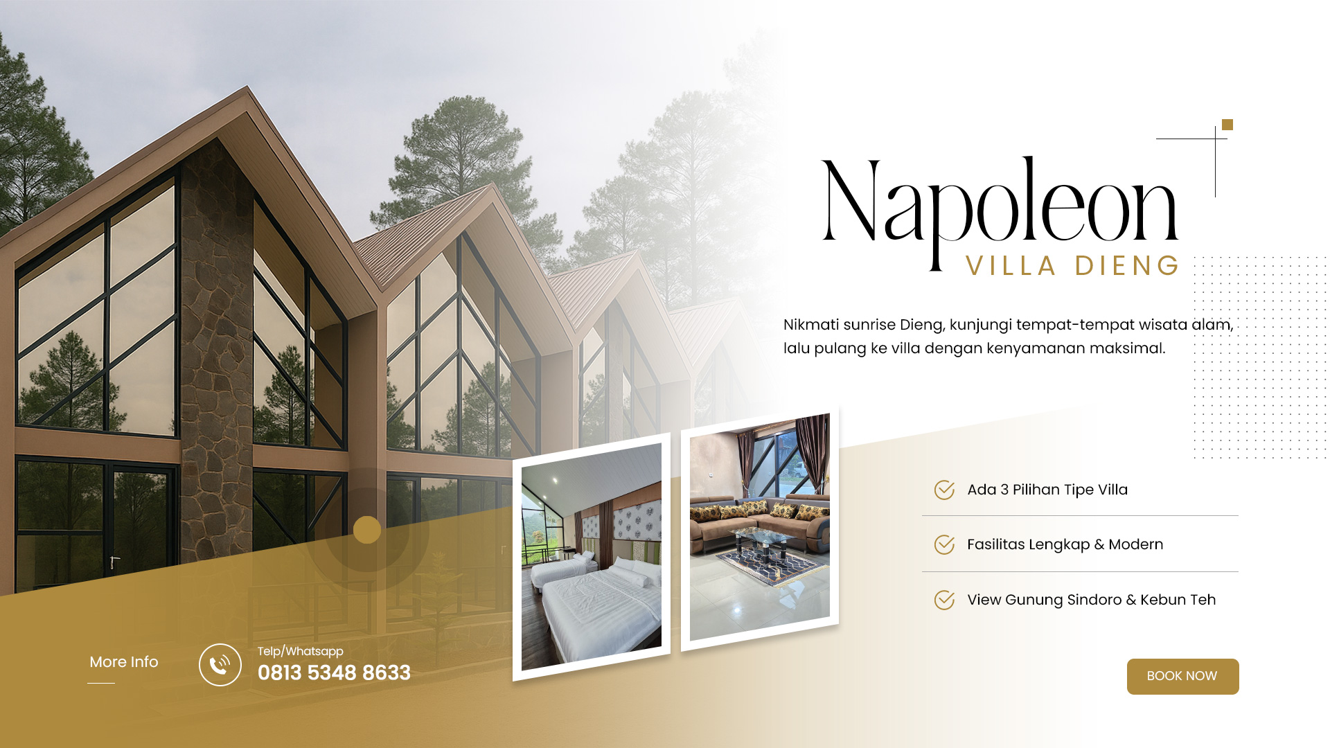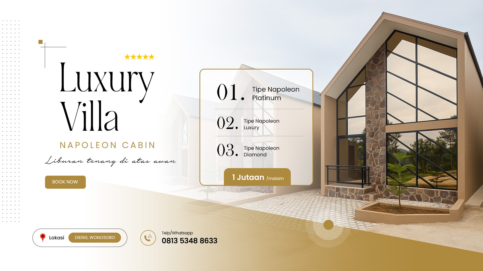 Siapa bilang menginap di villa mewah harus mahal? Di Villa Napoleon Dieng, Anda bisa menikmati fasilitas lengkap, interior modern, dan pemandangan alam yang menakjubkan dengan harga yang tetap ramah di kantong. Booking sekarang dan dapatkan harga spesial sebelum penuh!